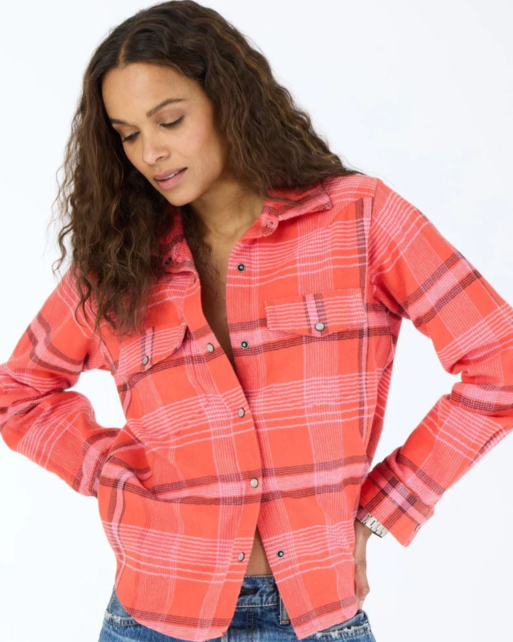 The Pia Western Flannel Plaid Shirt is a classic staple with a nod to Western shirting, crafted in the the happiest colors & softest cotton flannel. The Pia can be worn open over a tank or on its own with your favorite denims. Kerri Loves to layer it under our Workday Blazer.