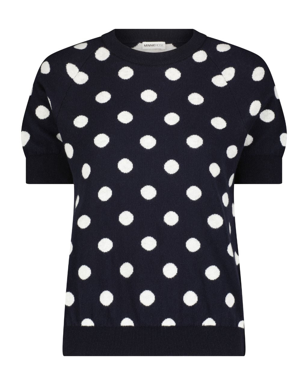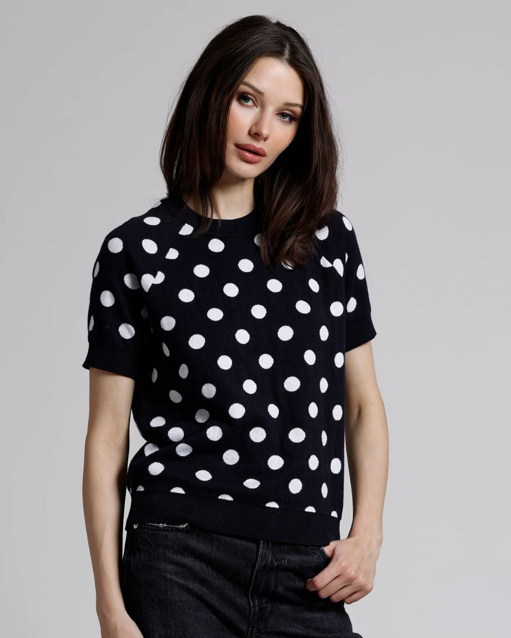 This cozy and charming top features an eye-catching polka dot pattern, adding a touch of playful flair to your outfit. Flip it inside out and the colors switch, giving you two fabulous looks in one! Crafted from a luxurious cotton cashmere blend, this short-sleeve crew provides the ultimate softness against your skin while ensuring breathability. The relaxed fit makes it perfect for layering or wearing on its own, making it a versatile staple for any season.