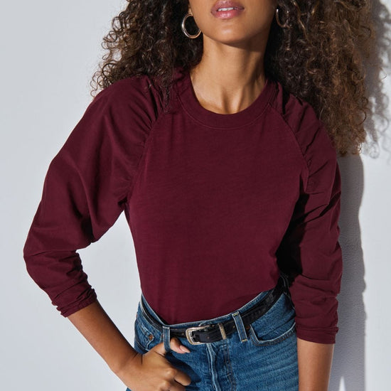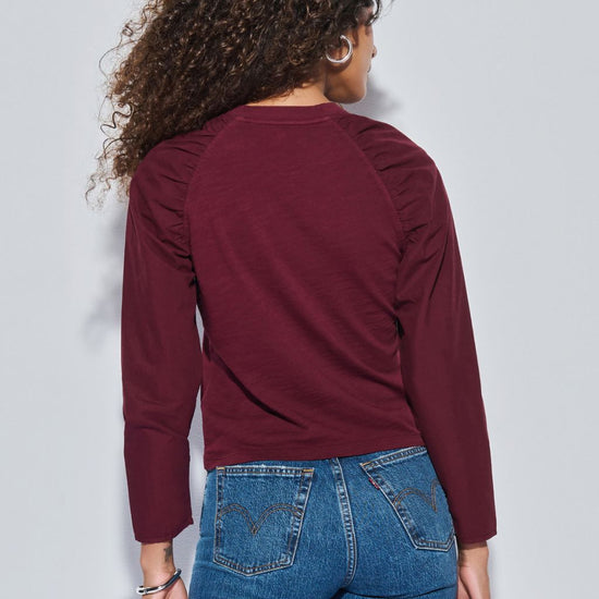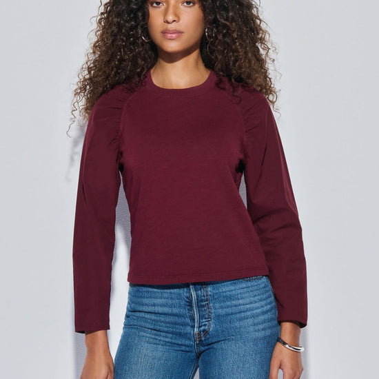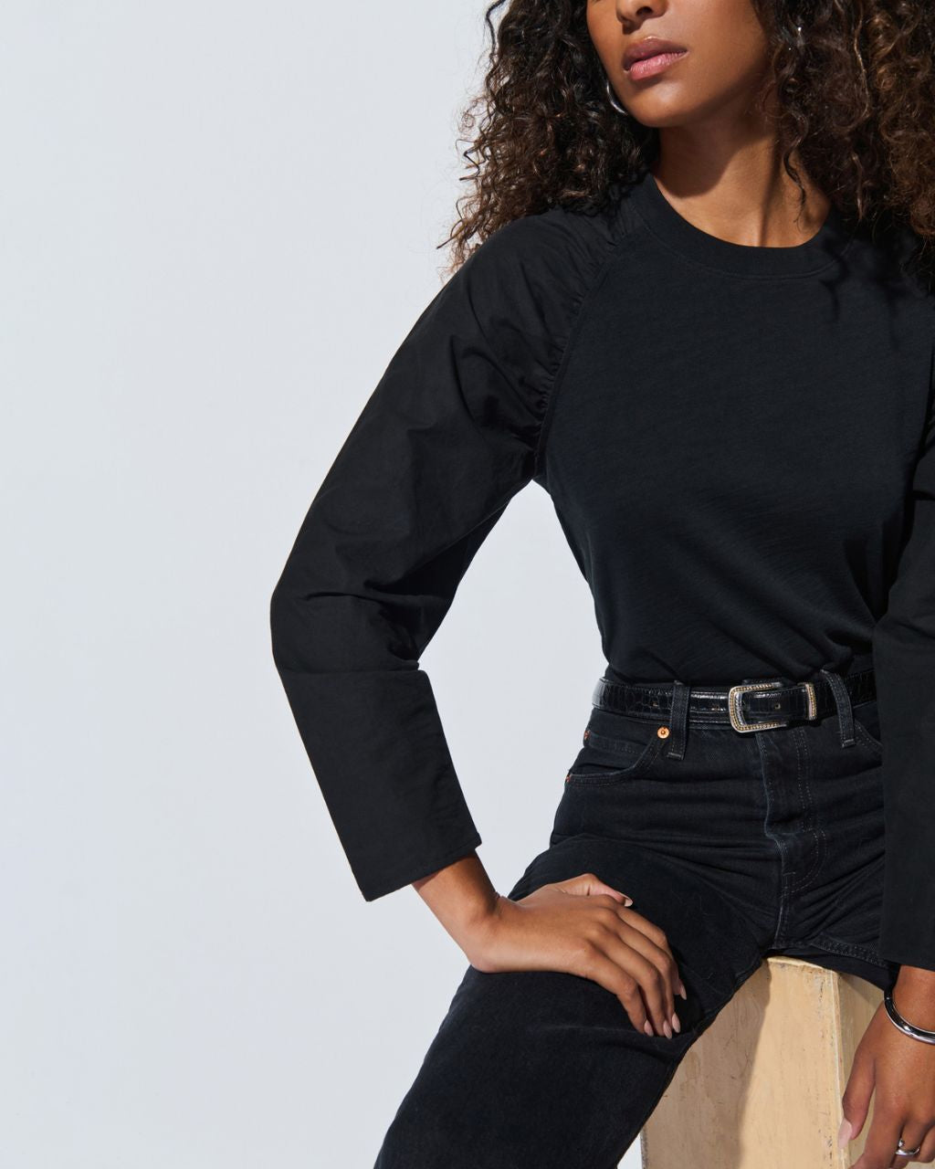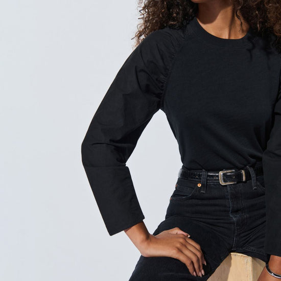 A classic, crew neck long sleeve with a little spice. Contrast cotton poplin sleeves elevate the raglan look while the ribbed neckline and body keep it easy and casual. As always, the possibilities are limitless.