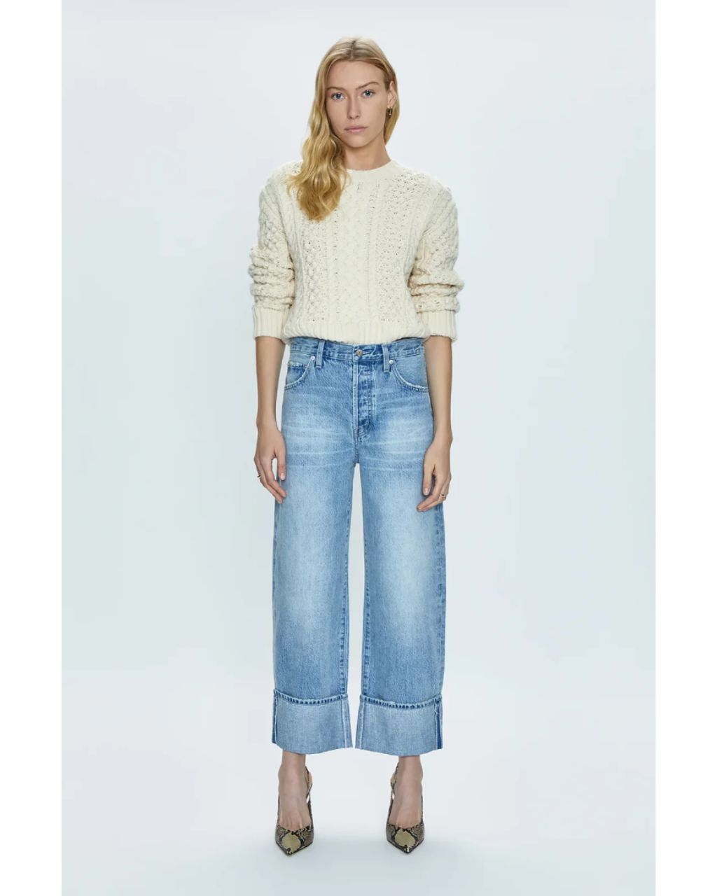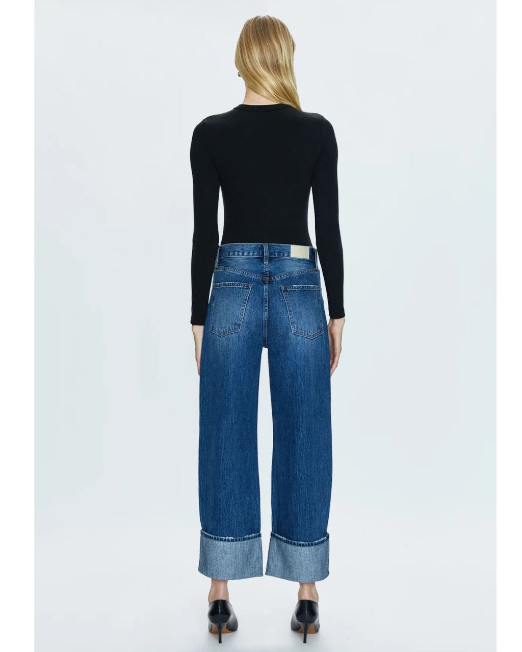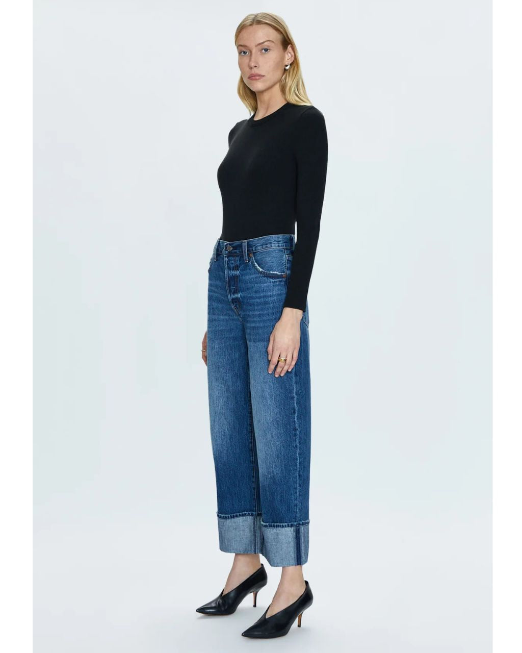 Effortless cool, expertly realized. High rise waist with a relaxed, straight leg fit and an oversized cuffed ankle hem. Crafted from rigid, lightweight denim without stretch for an expert fit that holds its shape.