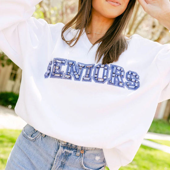 Embellished in sparkly blue stones, this white v-neck "Seniors" sweatshirt is unbelievably soft, and looks great tucked in or left out. Perfect for someone about to graduate or getting ready to enter their final year of school.