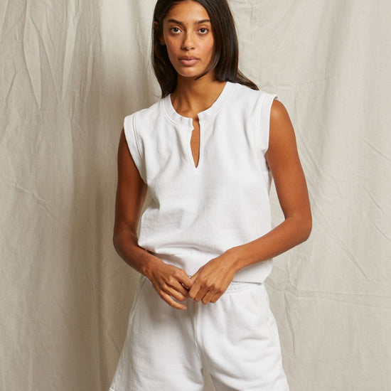 made from soft french terry, the sloane tank has just the right amount of structure with a clean cut at the neckline for a sexy vibe and an elastic waistband for that perfect blousey effect.