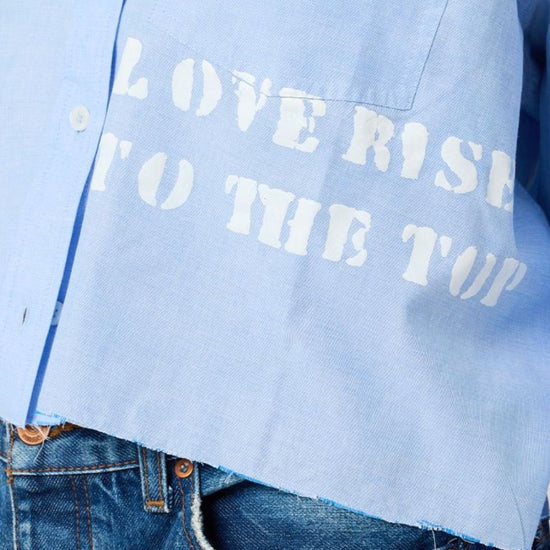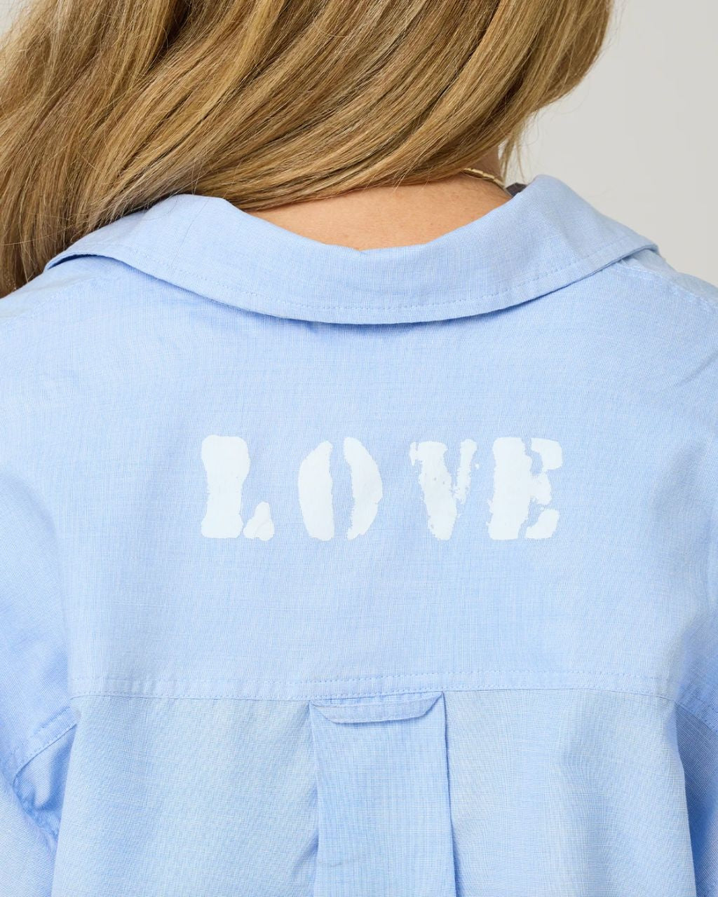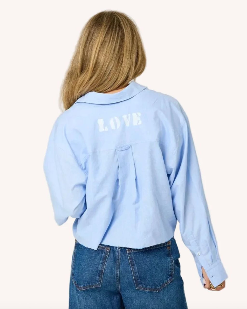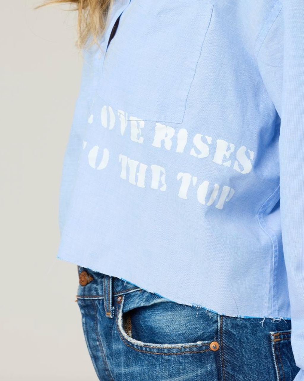 Not your average button-down. The Tia Shirt is that perfect fit, a bit boxy with a raw-edge hem, not too big, not too small, with a little bit of edge and a lot of heart. It’s finished with a hand-painted stencil from Kerri’s artwork: LOVE RISES TO THE TOP. Layer it, pop the collar, or wear it on its own.