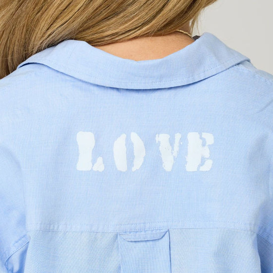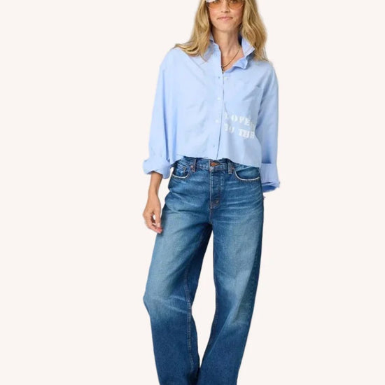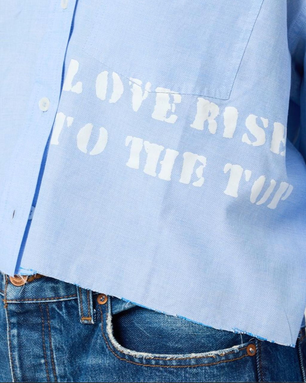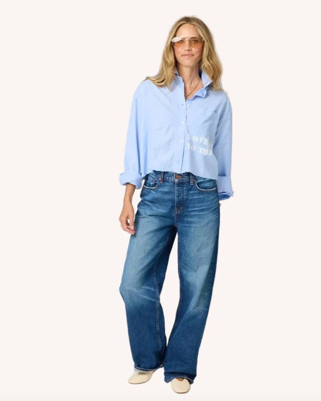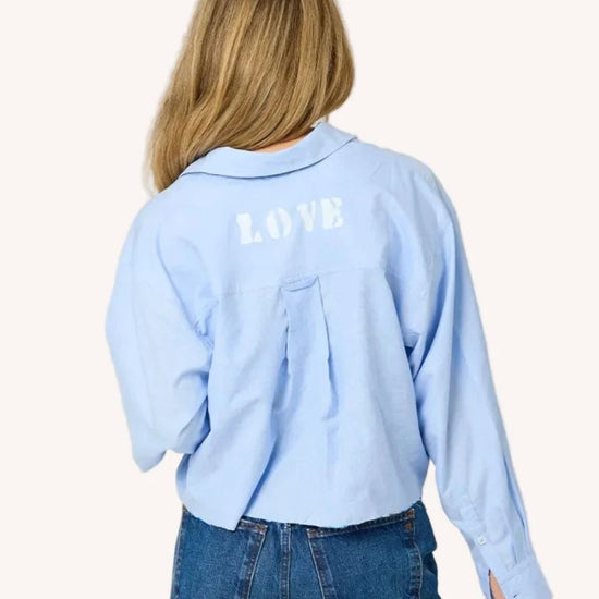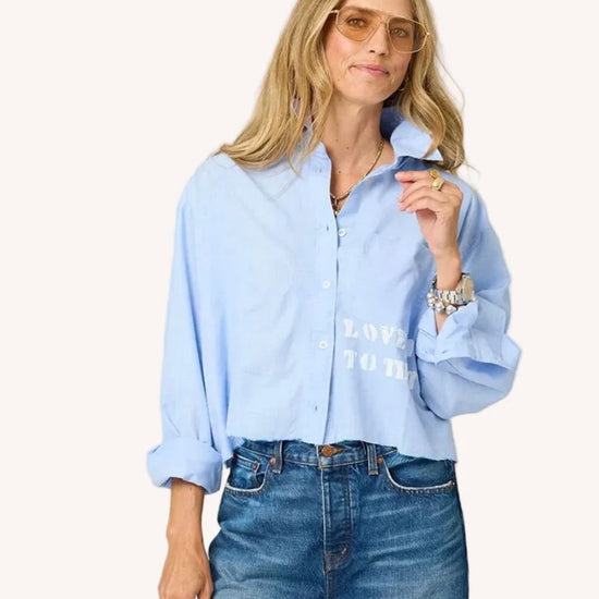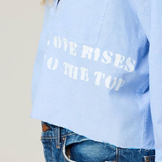 Not your average button-down. The Tia Shirt is that perfect fit, a bit boxy with a raw-edge hem, not too big, not too small, with a little bit of edge and a lot of heart. It’s finished with a hand-painted stencil from Kerri’s artwork: LOVE RISES TO THE TOP. Layer it, pop the collar, or wear it on its own.