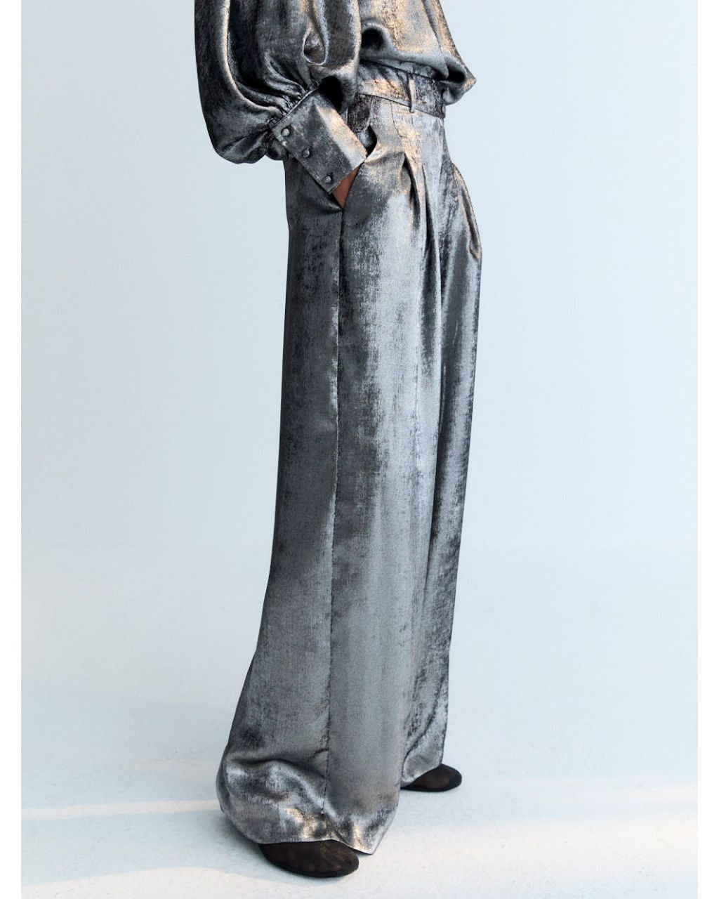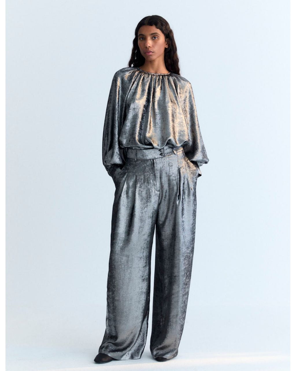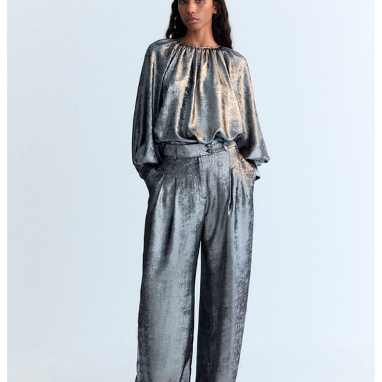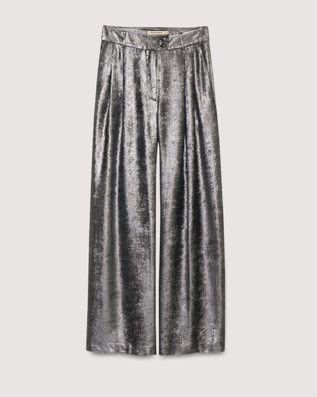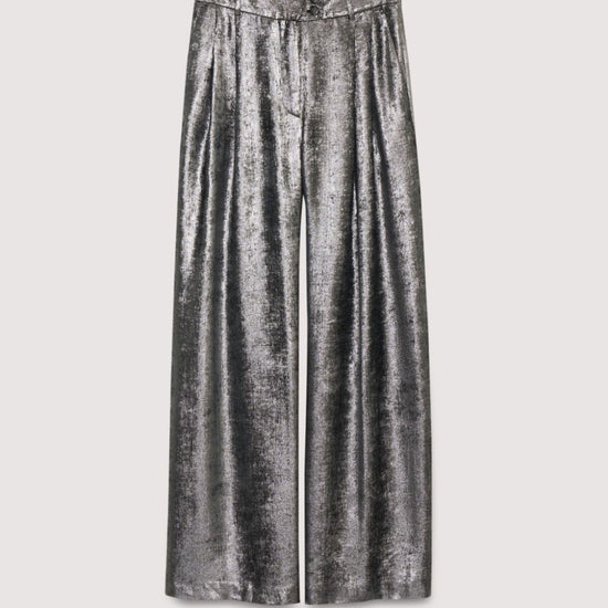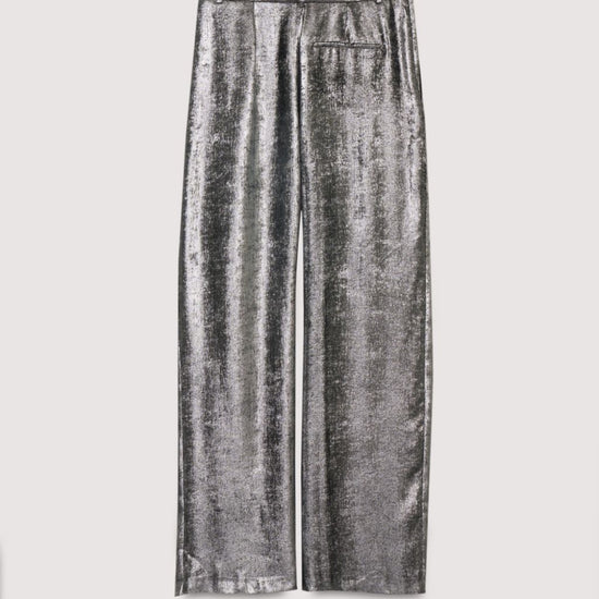 Make a statement in these liquid-like metallic pants by The New Society. Pair them with the matching Uxia Blouse for a silver-on-silver moment or tone them down with a white tee for a chic night out.100% polyester.