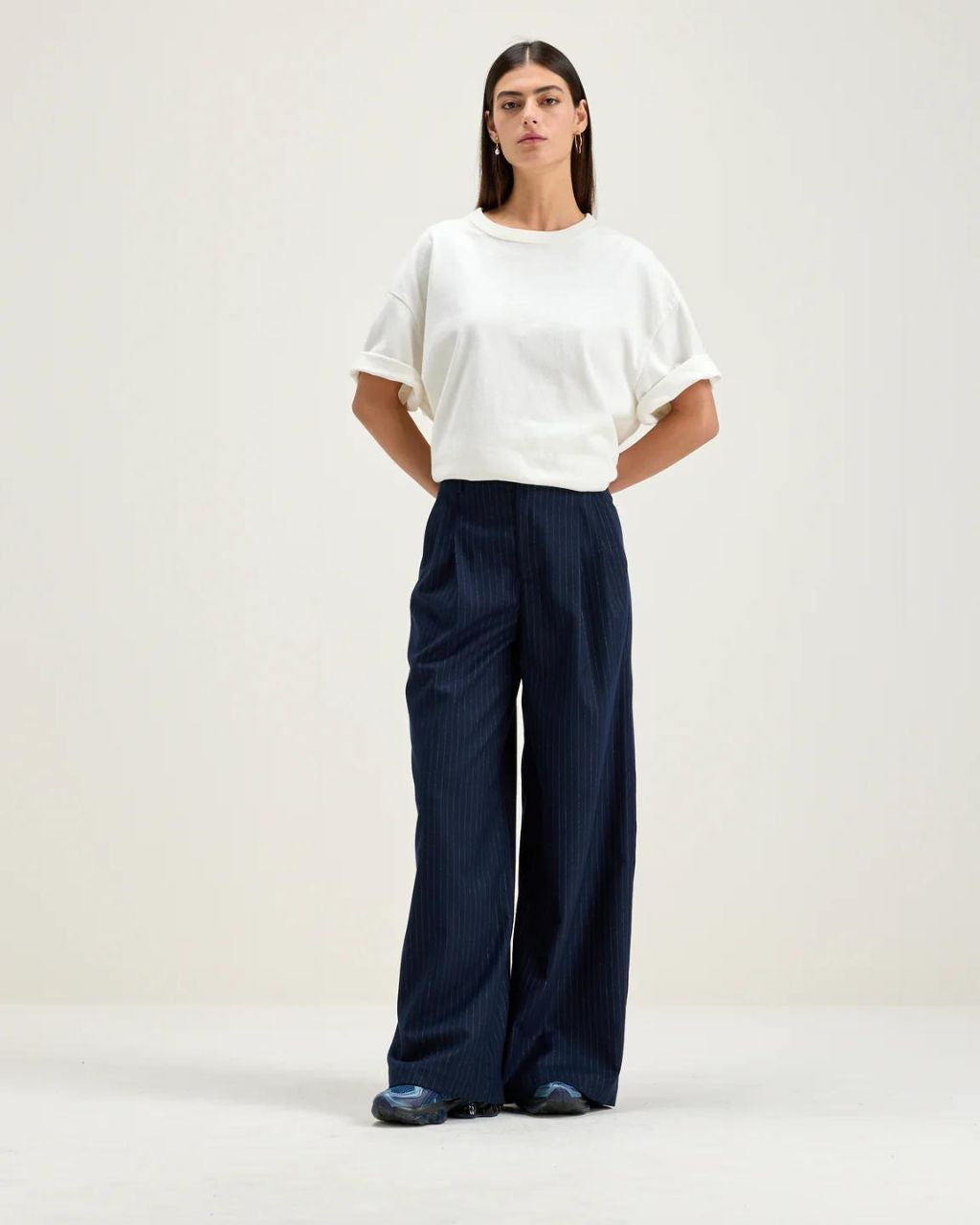 High-rise, wide-leg tailored pants with front pleats, made from classic pinstripe fabric. Pleated front. Tailored style. Welt back pockets with buttons.