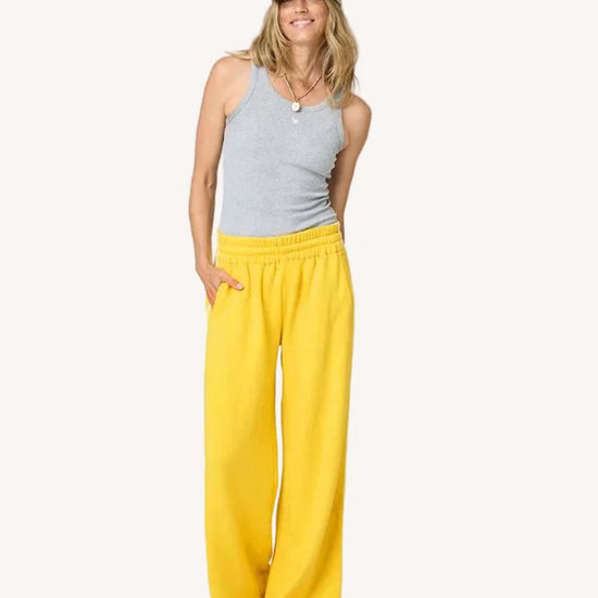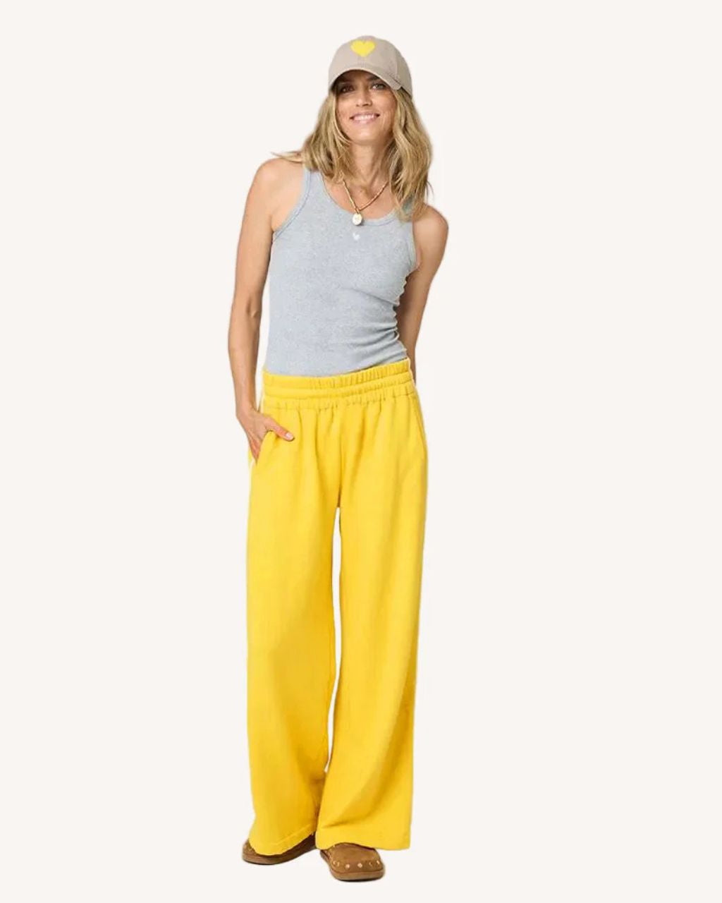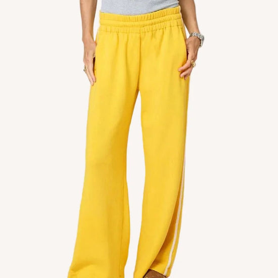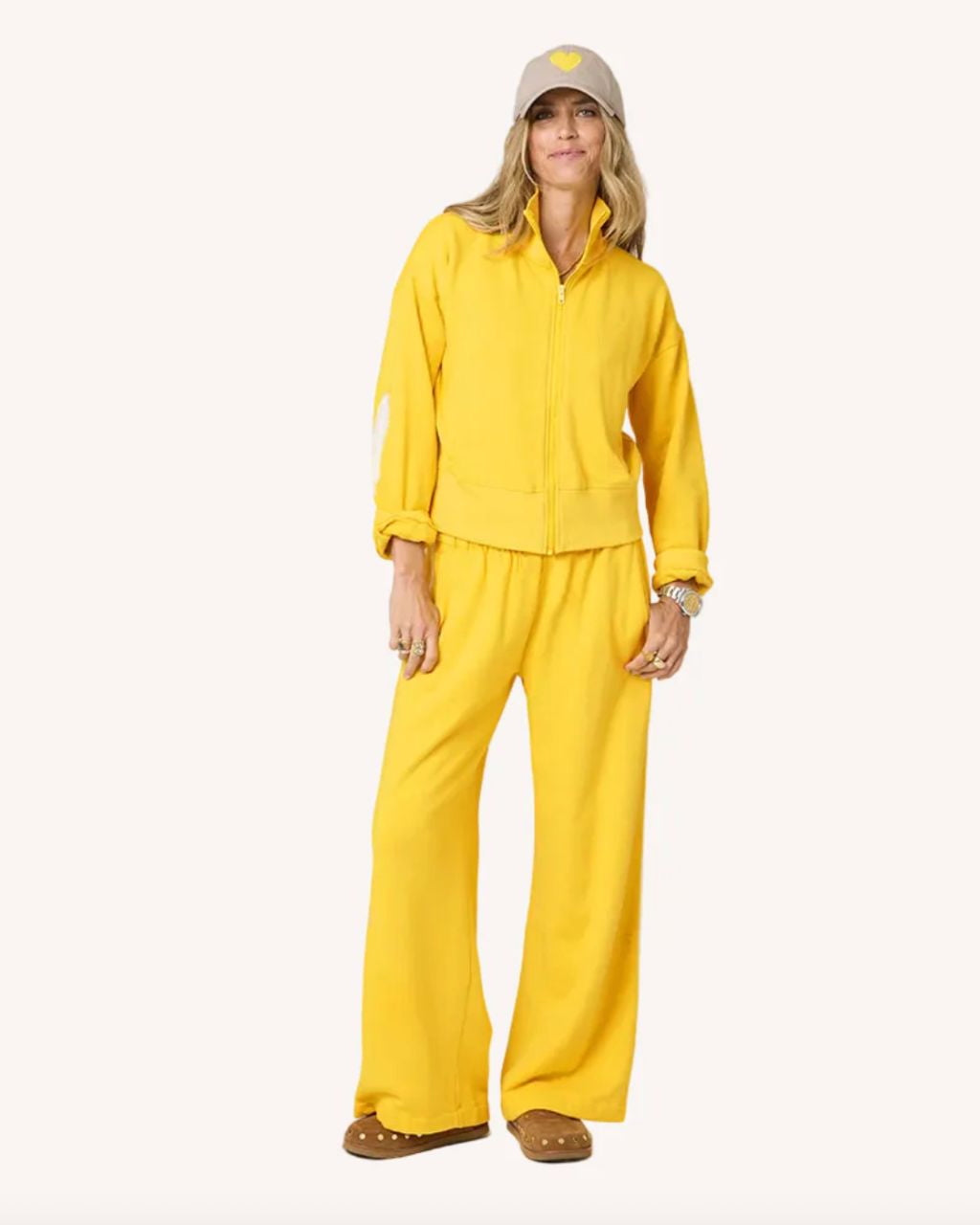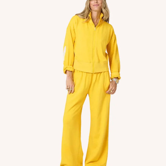 The Weekend Palazzo Sweatpant in cotton fleece, feels like sweats and looks like trousers with a sporty stripe down each leg. Pull them on, style your look and mix with the matching Zip Up Sweatshirt for a perfect little set.