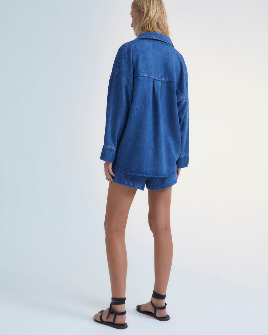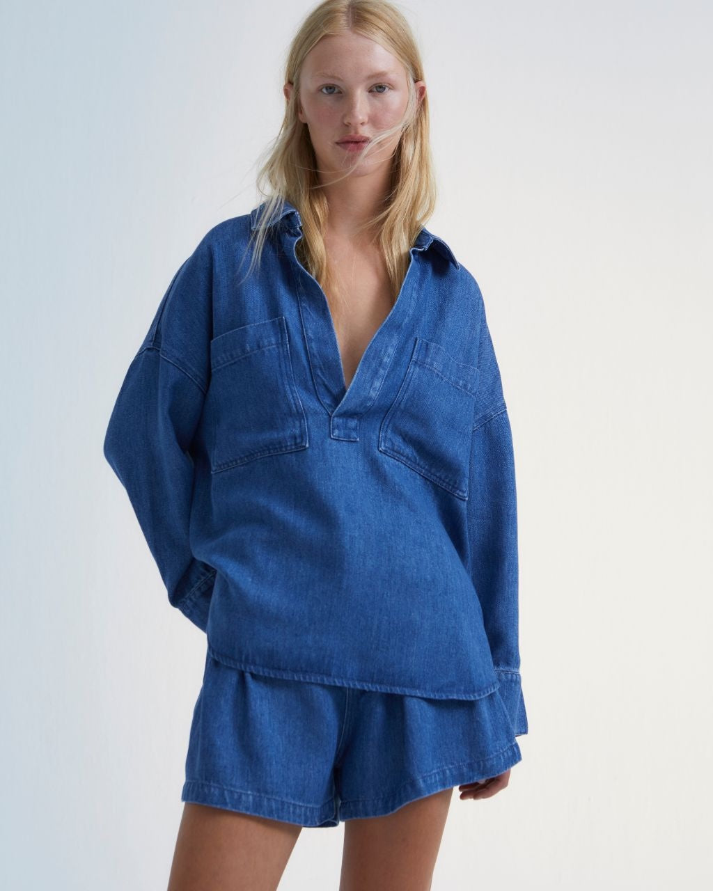 Blouse in 100% cotton BCI in blue denim. Shirt collar with opening, patch pockets at front, round bottom and yoke with pleats at back. Made in Portugal. Perfect to combine with the matching pant.