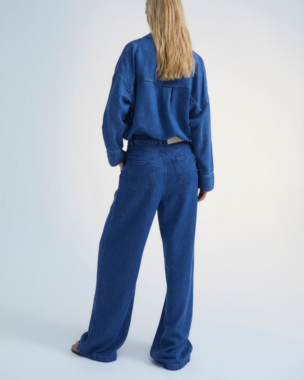 Pant in 100% cotton BCI in blue denim. Regular fit, pleats at front and stitch detail at patch pockets. Made in Portugal. Perfect to combine with the matching blouse.