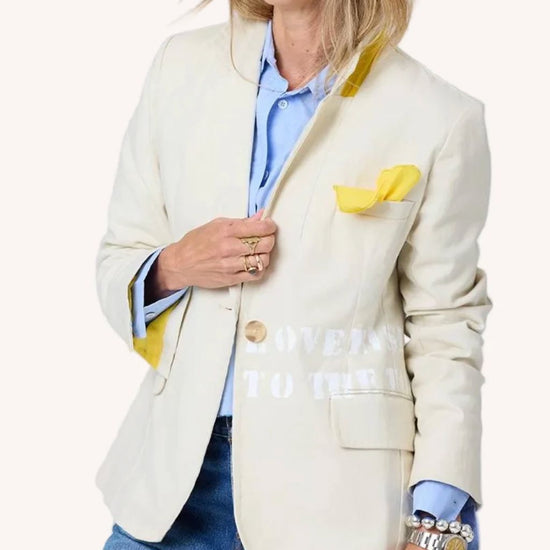 The Love Rises blazer is wearable art with intention. Finished with Kerri's hand-stamped artwork and a heart-shaped hanky in the pocket, this is a timeless silhouette. Style it casually with denim and a tee, or layer it over a sweater or button-down for a more polished look. This blazer is designed to move easily, between work, weekend, and everything in between, adding personality to any outfit.