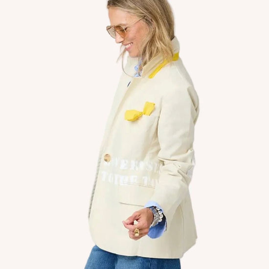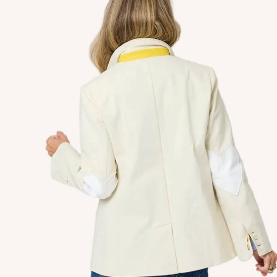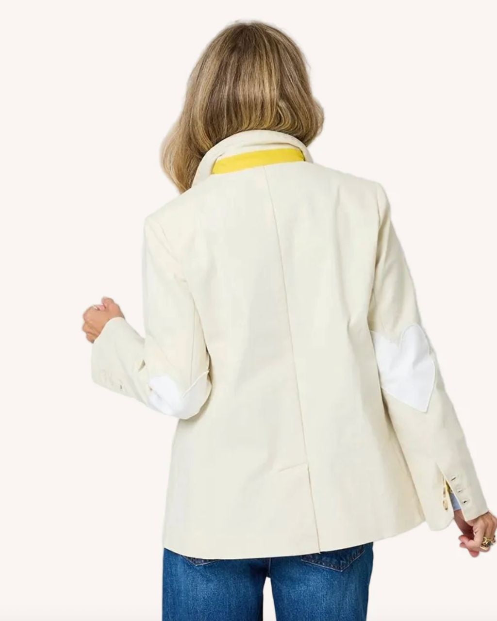 - Single breasted blazer, one top pocket with a removable heart shaped hanky, artwork stamped on side, contrast white Imperfect Heart elbows, yellow under collar.